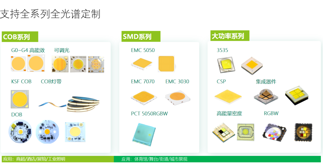 主要產(chǎn)品有:COB 全光譜產(chǎn)品系列、陶瓷大功率產(chǎn)品系列、SMD 產(chǎn)品系列,配備萬級無塵生產(chǎn)車間,擁有先進(jìn) LED芯片封裝產(chǎn)線和自動化、數(shù)字化管控體系,客戶主要為國際一線照明設(shè)施制造商或品牌營運商。